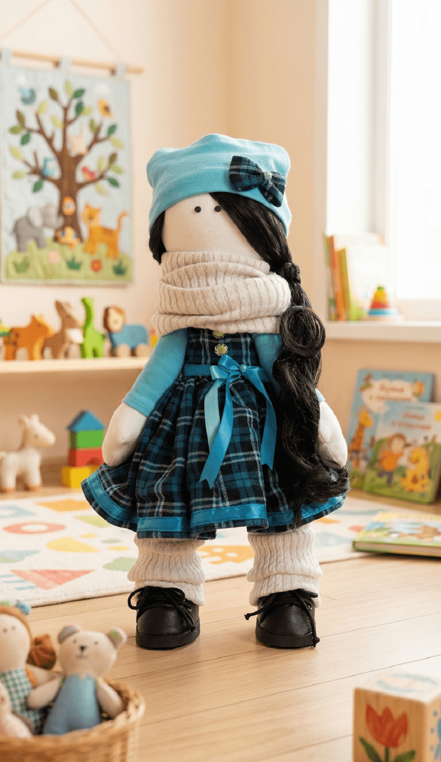 Elegáns kockás ruha: A mélykék és sötét árnyalatú kockás szoknya masnival díszítve klasszikus, mégis divatos megjelenést kölcsönöz neki. Ez az egyedi kézműves textilbaba igazi kis divatdiktátor a polcon!