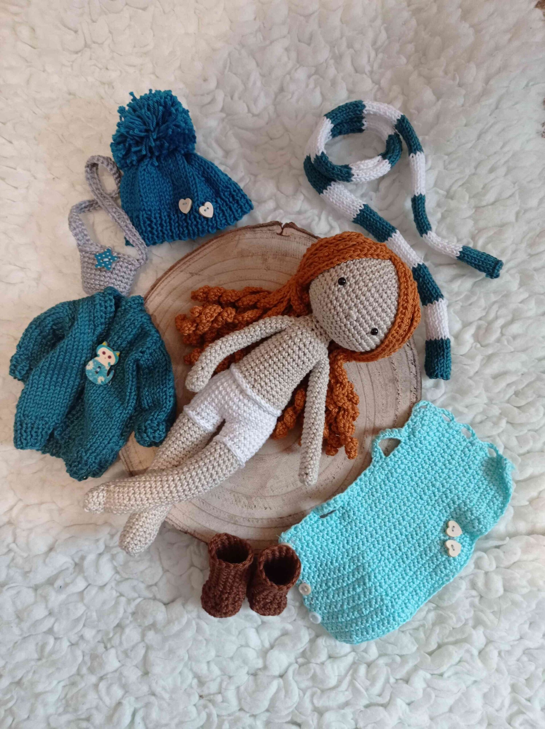 Szett tartalma: 1 db baba, 1 db ruha, 1 db kardigán, sapka, sál, csizma, táska.