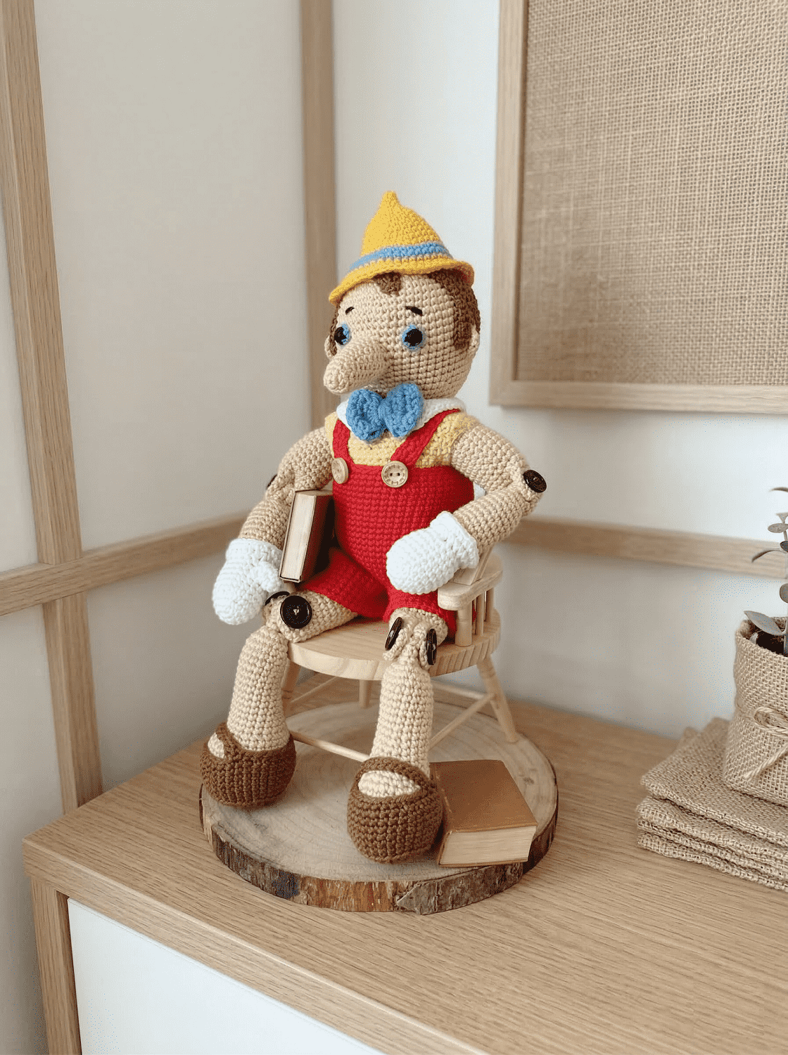 A mai műanyag világban a horgolt Pinokkió visszahozza a kézzel készült tárgyak becsületét. Ez a figura nem tömeggyártásban készül, minden egyes darabnál figyelünk a szoros horgolásra, hogy a tömőanyag ne látsszon ki a szemek között. A sárga ing, a piros nadrág és a tollas kalap színei nemcsak a gyerekek figyelmét kötik le, hanem a szoba díszévé is teszik a figurát. Kiváló választás lehet óvodai beszoktatáshoz „alvósként”, vagy egyszerűen csak a mesélések kísérőjeként.