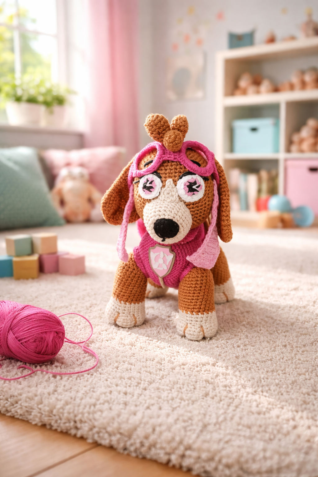 Repülj a kalandokba ezzel a kézzel készült, horgolt Skye figurával! A Mancs Őrjárat bátor pilótakutyusa most puha, amigurumi formában érkezik meg hozzád. Minden részlete – a rózsaszín repülős szemüvegtől a jelvényéig – gondos, kézi munkával készült, hogy a legkisebb rajongóknak is hű társa legyen