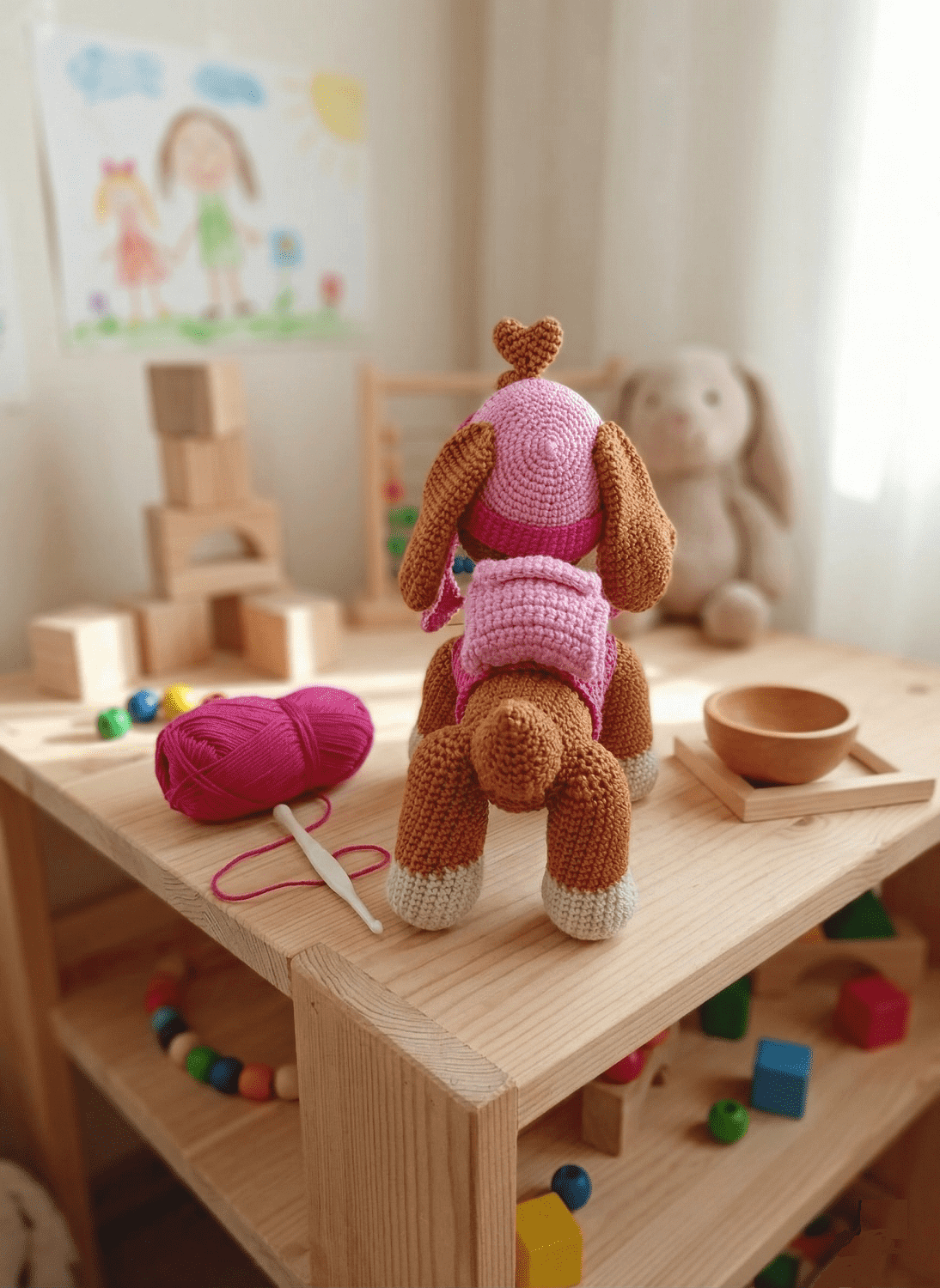 Részletgazdag kivitel: Horgolt kiegészítőkkel és biztonságos rögzítéssel készült.