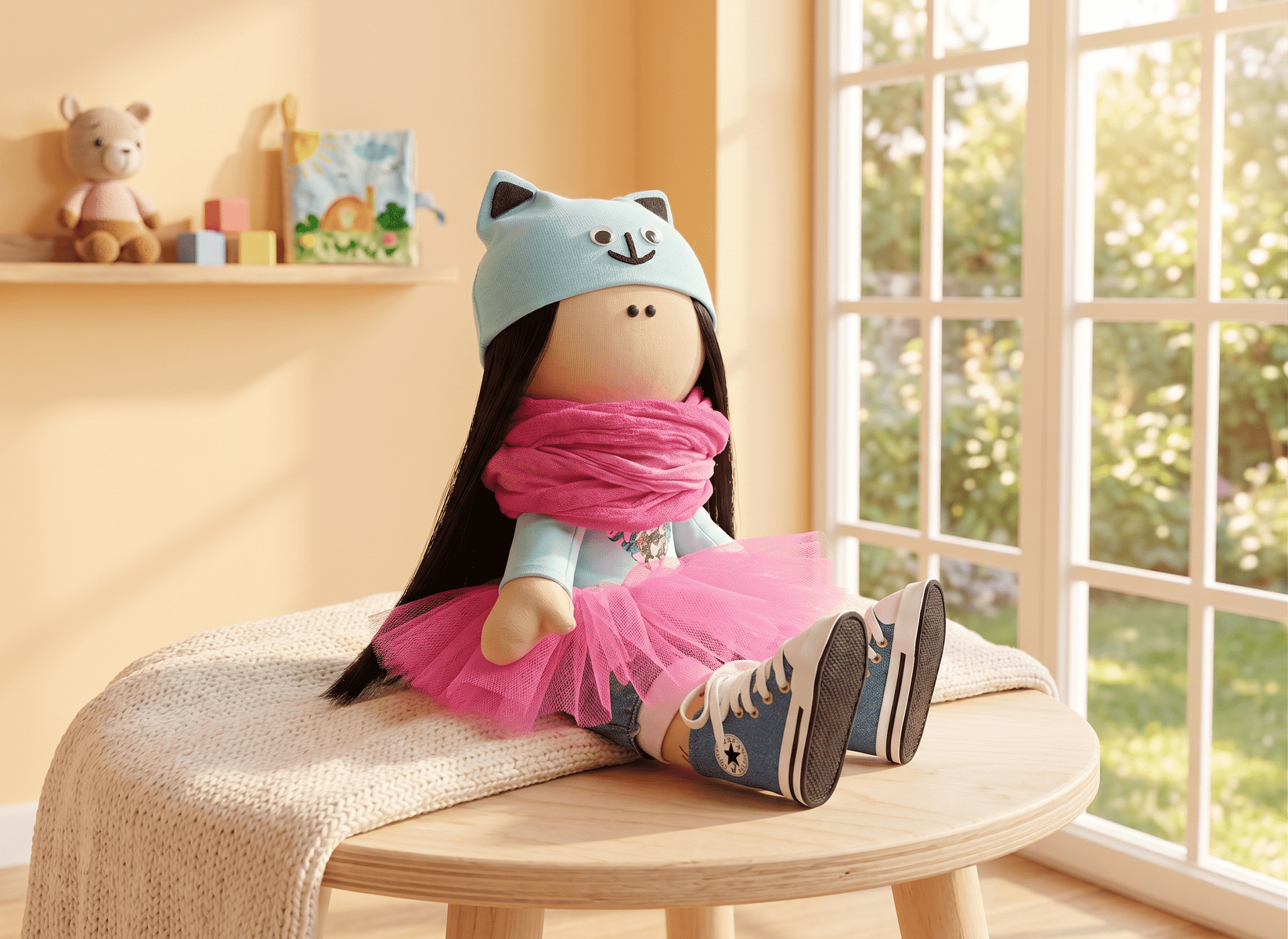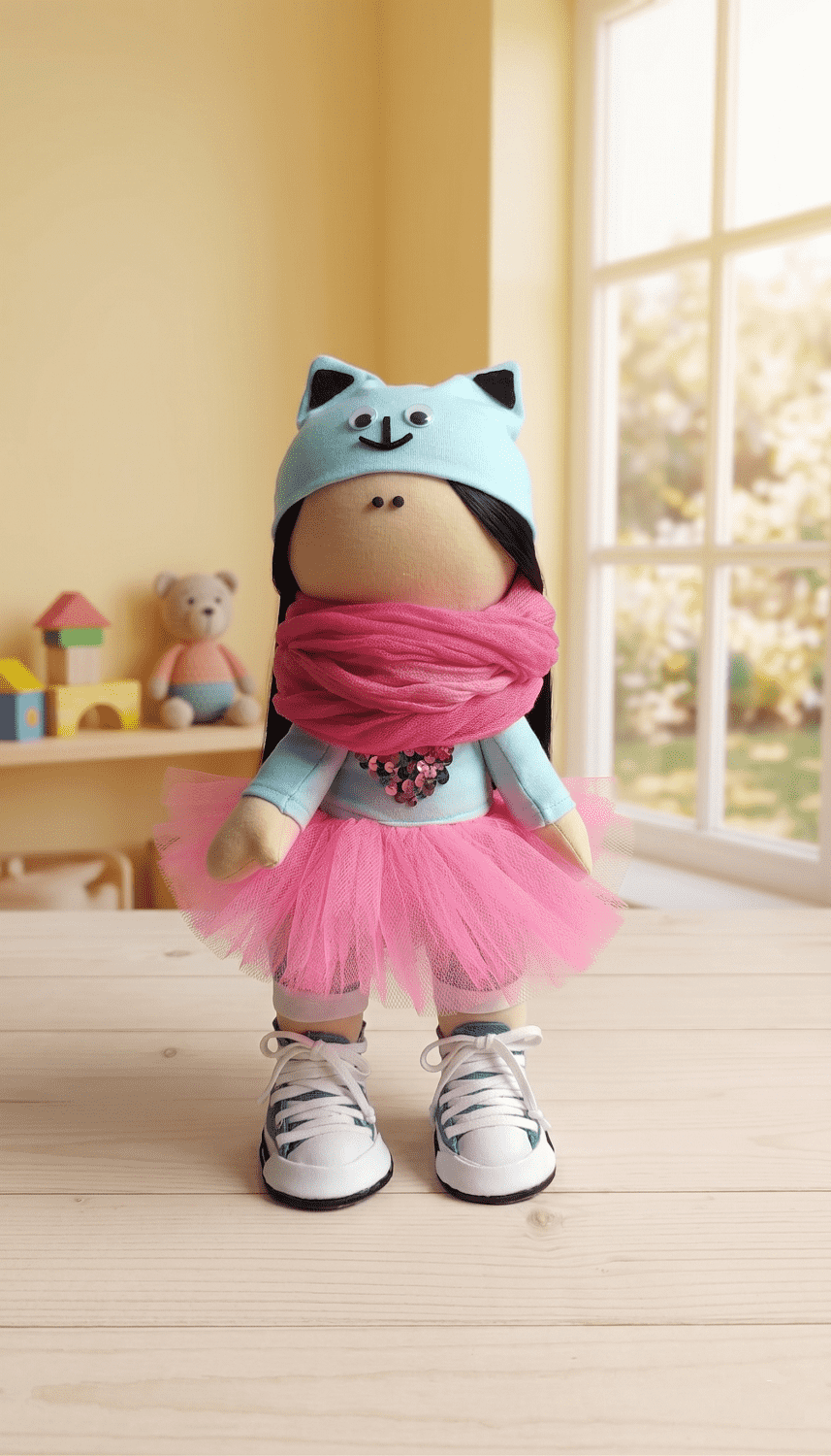 Legyen szó születésnapról, karácsonyról vagy keresztelőről, a tüllszoknyás baba garantáltan mosolyt csal az arcokra. A pasztellkék és a vibráló rózsaszín színek harmóniája miatt bármilyen modern gyerekszoba polcán remekül mutat dekorációként is.